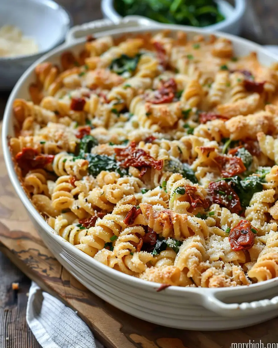 Baked Boursin Cheese Pasta with Sundried Tomatoes and Spinach is a creamy and indulgent dish that combines the rich flavors of Boursin cheese, savory turkey bacon, and vibrant spinach.