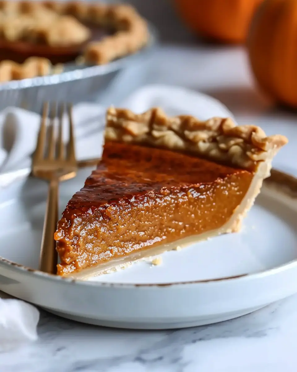 Presentation is key! Consider placing your bourbon brûlée pumpkin pie on a rustic wooden board or a beautiful ceramic pie dish. After brûléeing the top, let it cool slightly. The caramelized crust adds a stunning visual appeal. Use a sharp knife to slice into perfect wedges, revealing the creamy filling inside. For an extra pop, drizzle some caramel sauce around the plate and garnish with a sprig of mint.