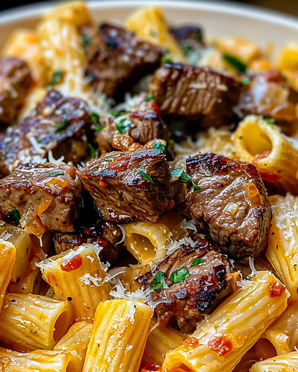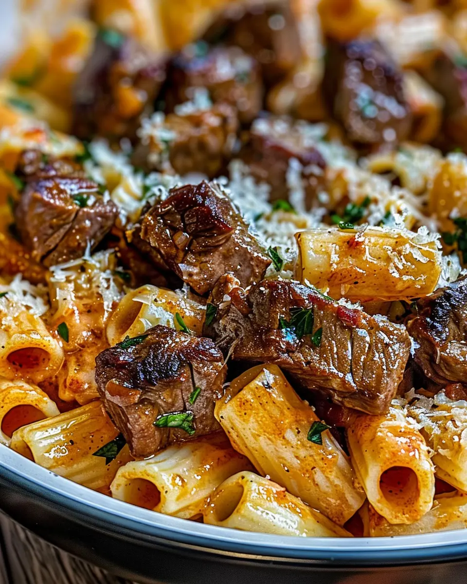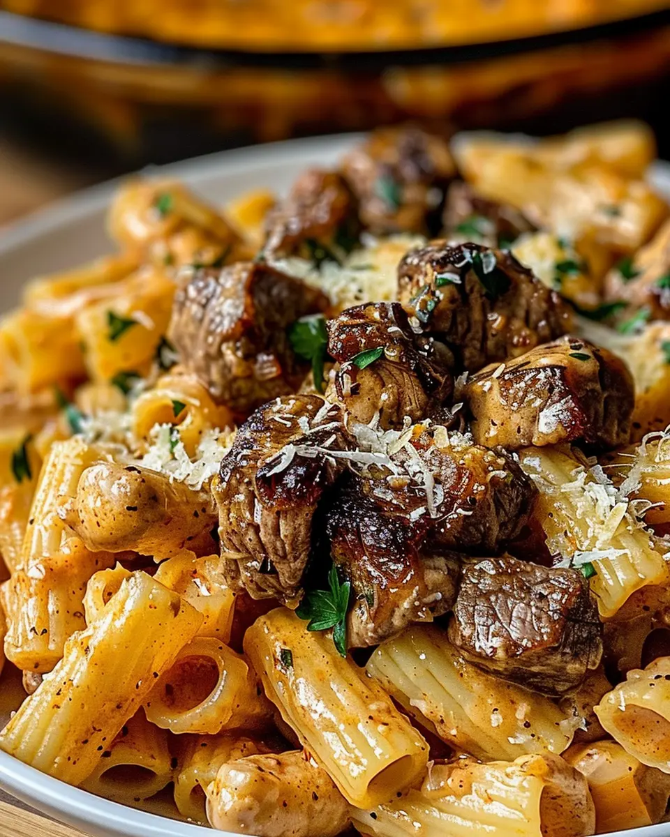 PrintCajun Steak Tips in Indulgent Cheesy Rigatoni Parmesan Sauce