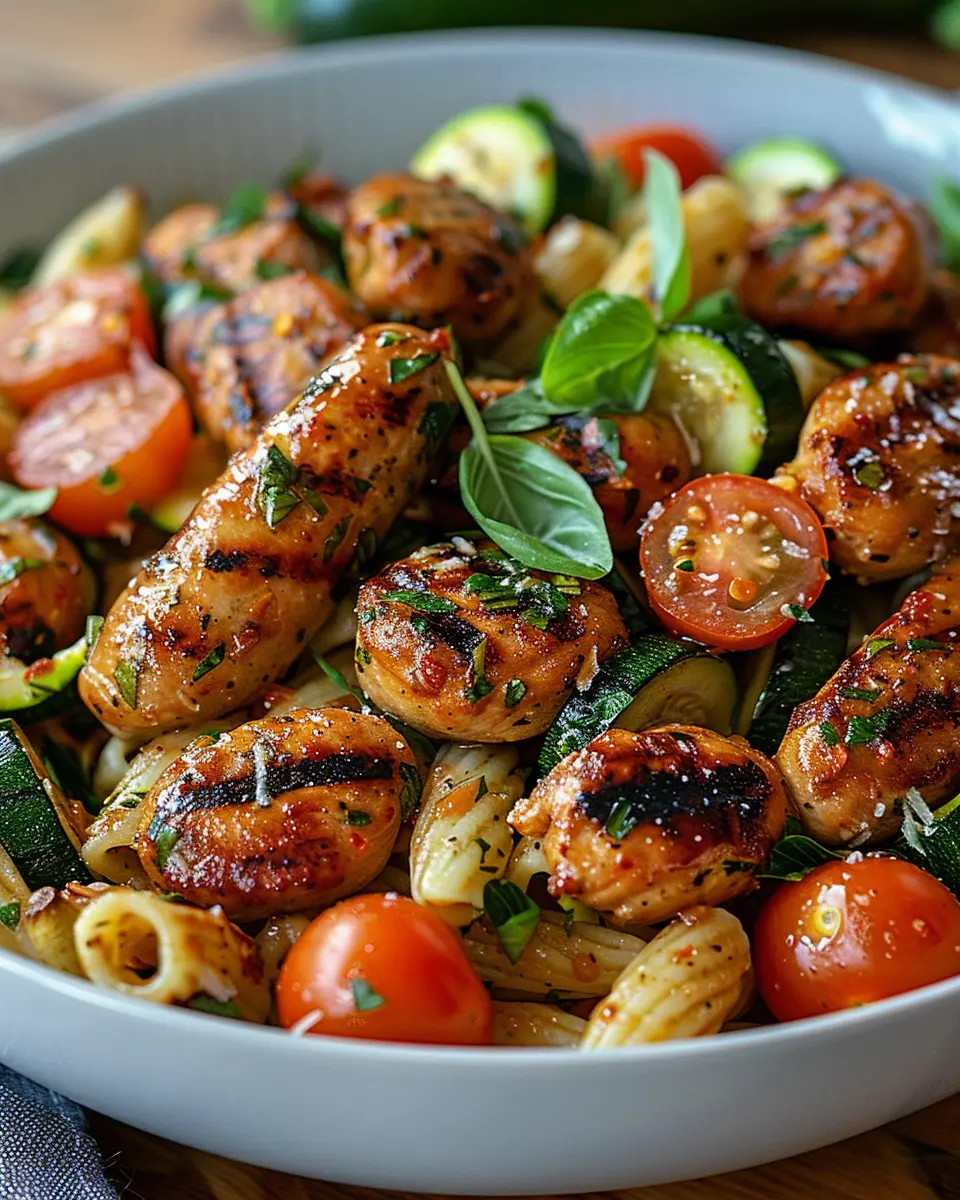 A satisfying and nutritious recipe featuring chicken sausages, zucchini, tomatoes, and pasta for a delightful meal.