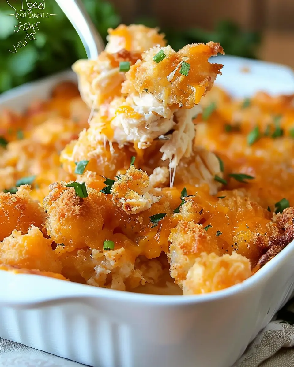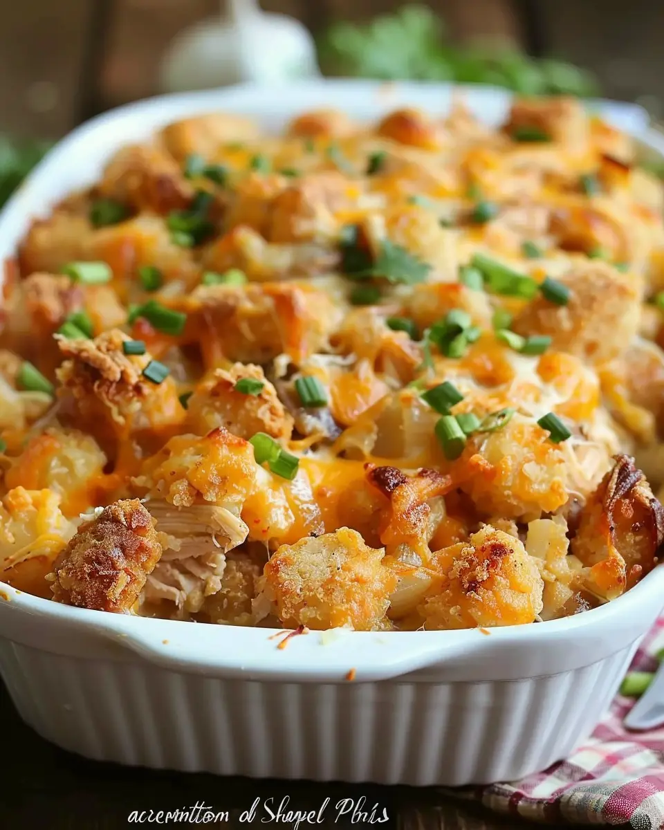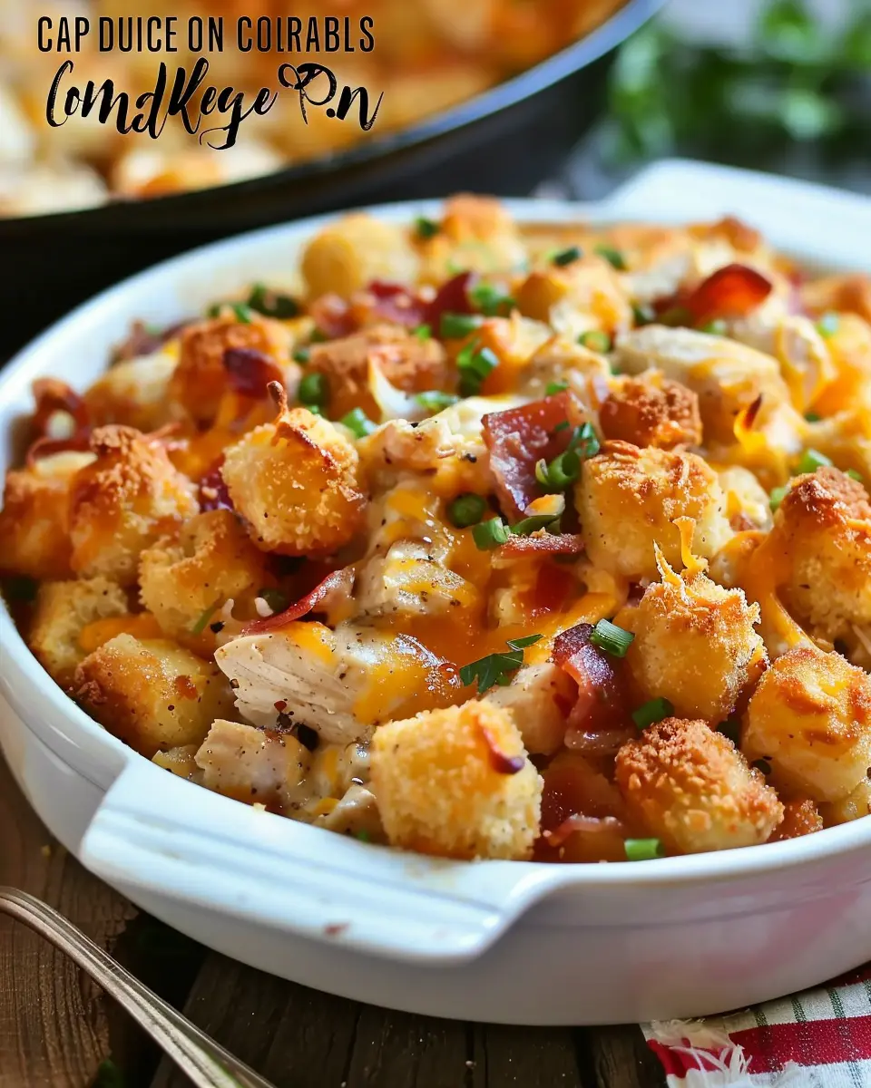 A delicious and comforting casserole combining chicken, bacon, and tater tots for a satisfying meal.