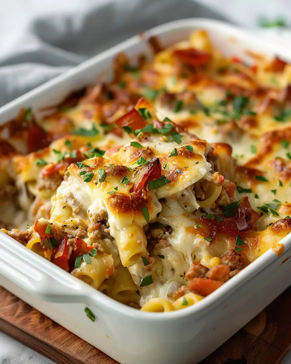 Now that your ingredients are prepped and your sauce is mixed, it’s time for the fun part: combining everything! In a large casserole dish, gently fold together the cooked egg noodles, turkey bacon, chicken ham, mixed vegetables, and the creamy sauce. Make sure everything is nicely coated.
