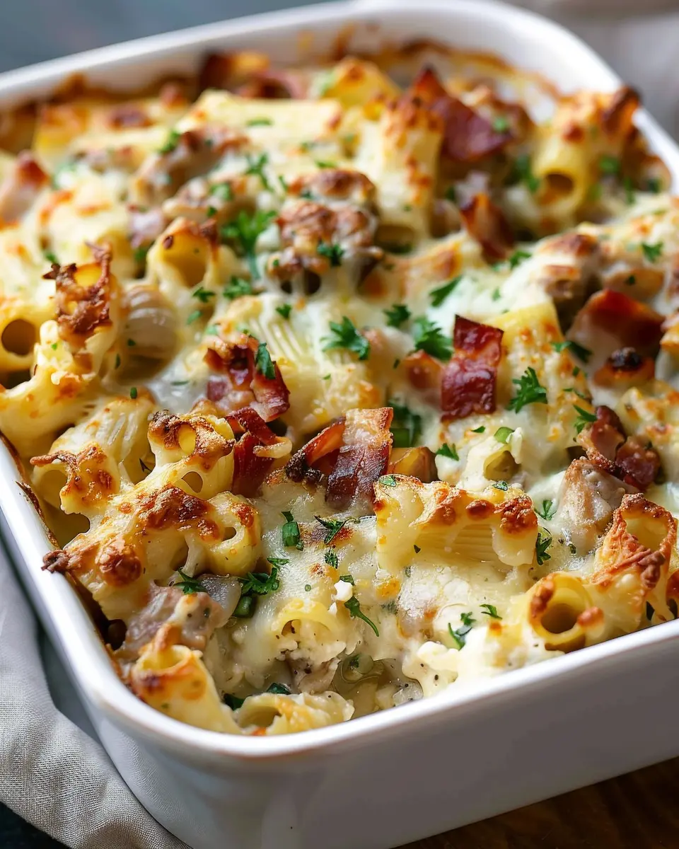 A delicious and indulgent casserole featuring turkey bacon and chicken ham, perfect for a family dinner.