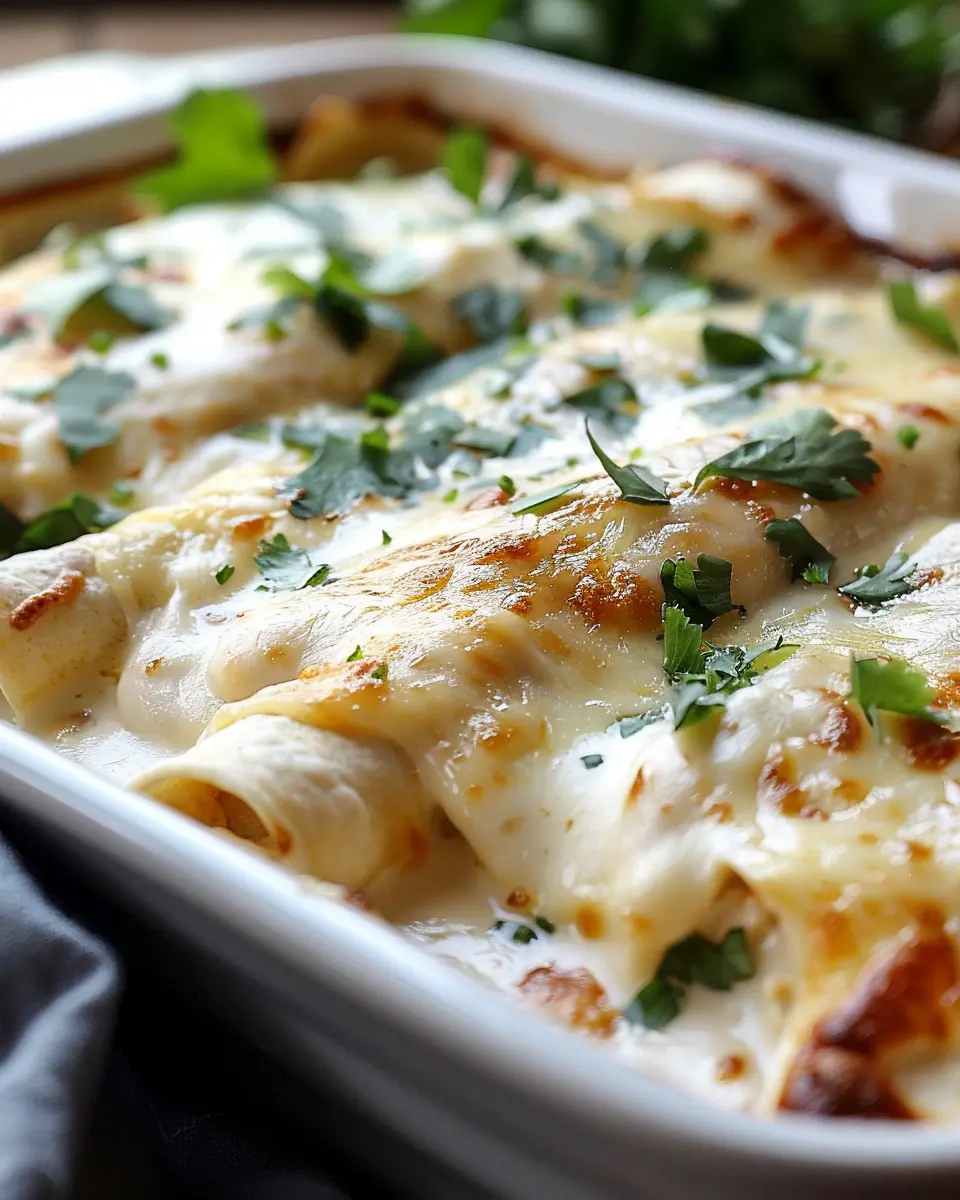 In summary, these creamy white chicken enchiladas are not only a feast for the taste buds but also a comforting dish that’s perfect for any occasion. The blend of savory chicken and rich sauce wrapped in soft tortillas is a match made in culinary heaven. If you’re looking to impress friends or enjoy a cozy night in, this recipe is a must-try! Feel free to personalize it with your favorite toppings—think avocado, fresh cilantro, or zesty lime for that extra kick. So grab your apron and give this delicious dish a whirl! You might just find a new favorite in your kitchen.