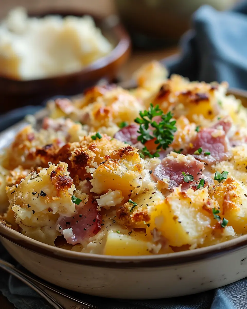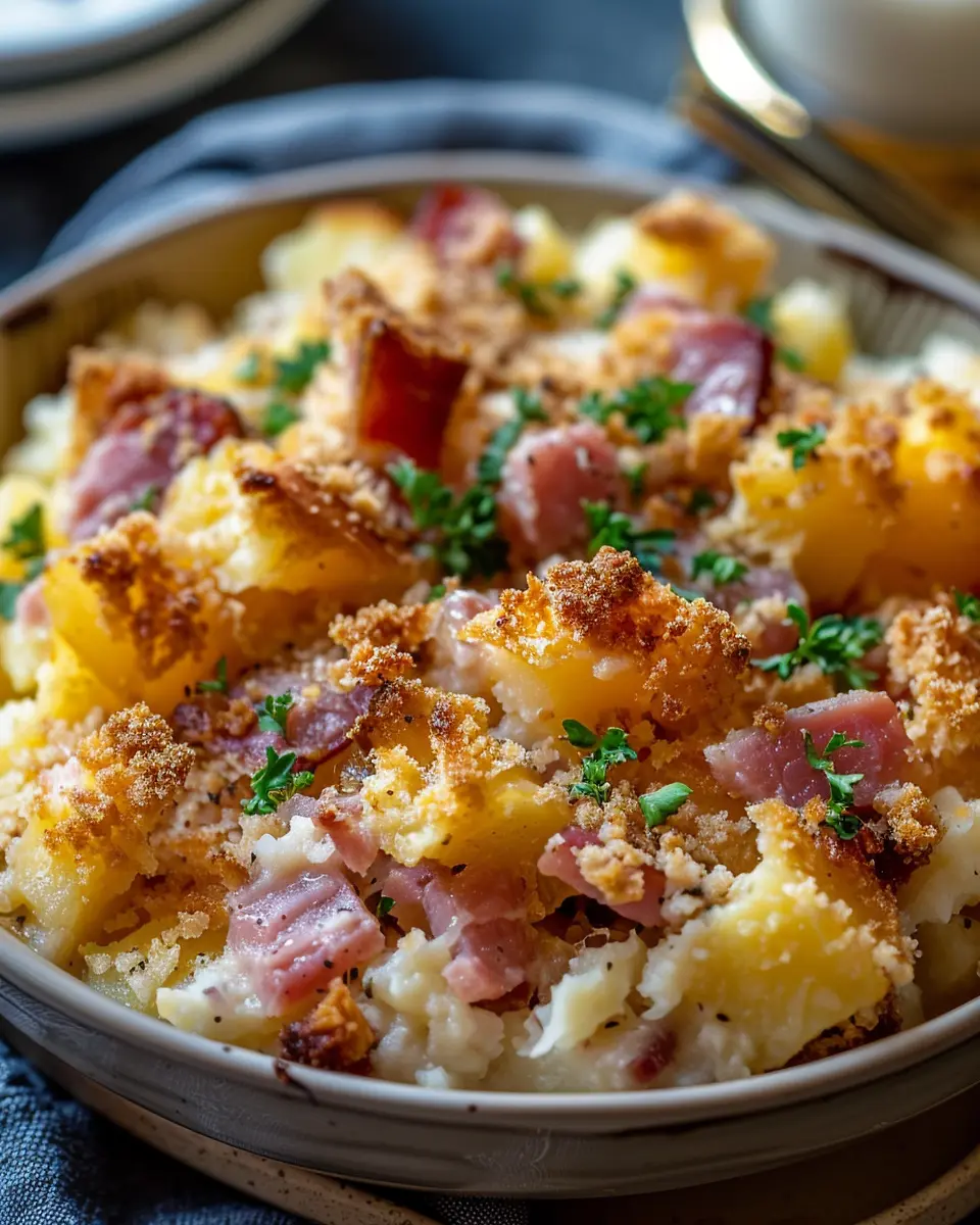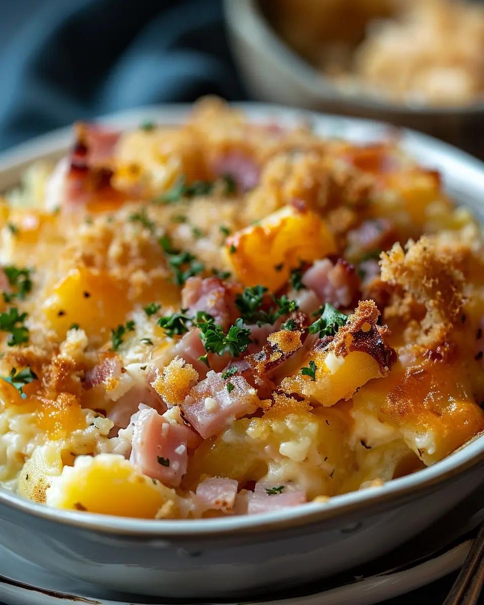 A delicious and easy-to-make casserole featuring ham and potatoes, perfect for your next family dinner.