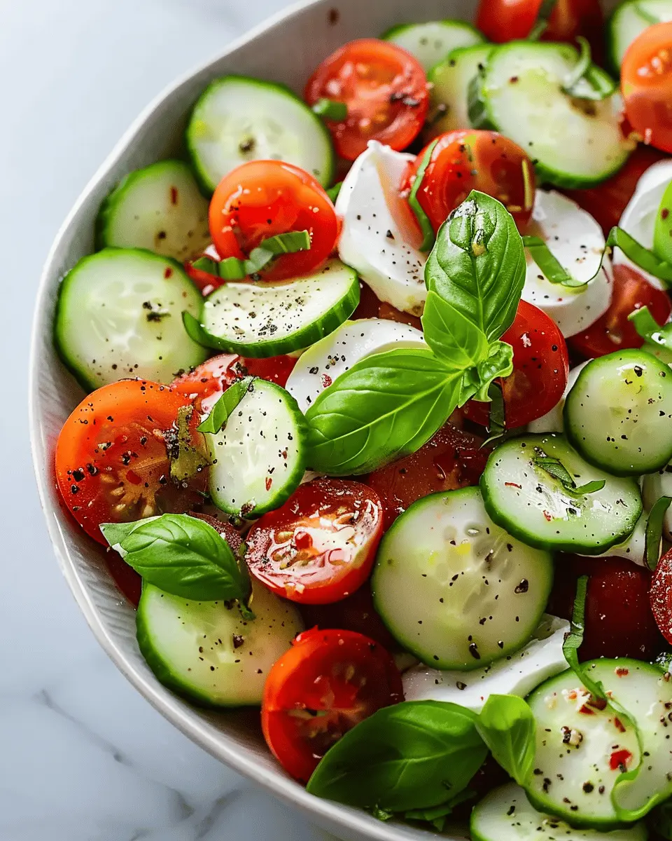 A refreshing and delicious summer salad featuring fresh cucumbers, mozzarella, and basil.