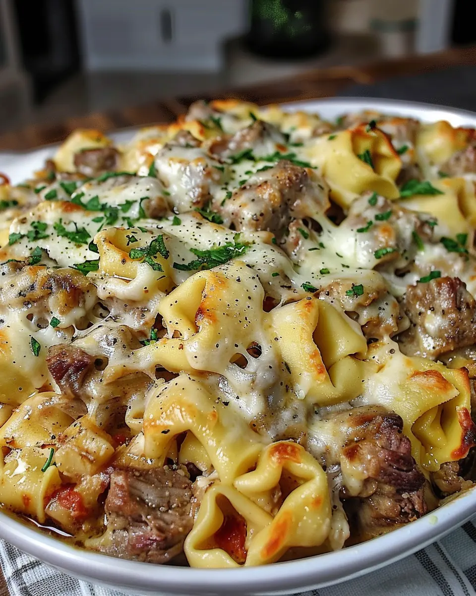A creamy and cheesy tortellini casserole loaded with steak and flavors, perfect for family dinners.