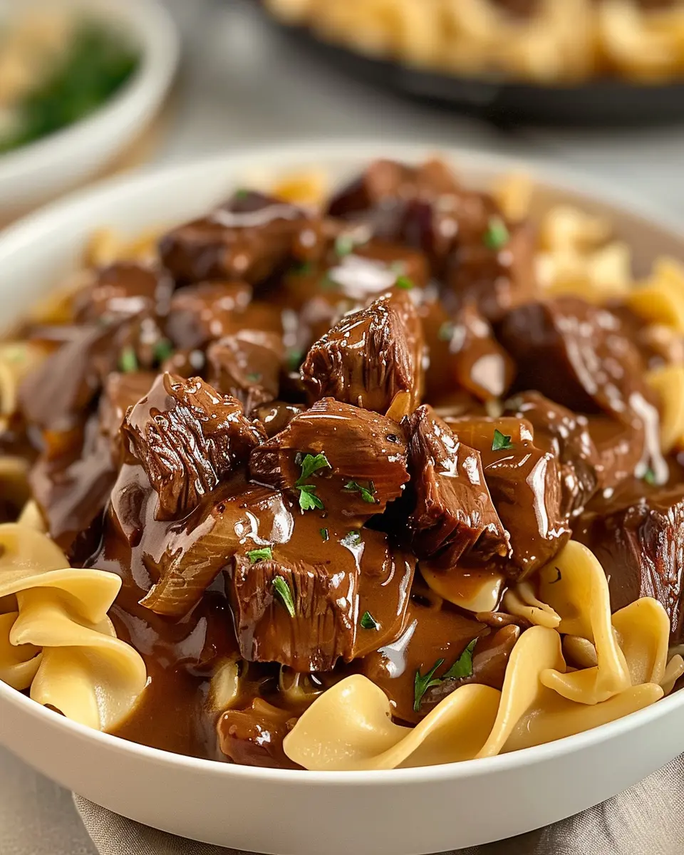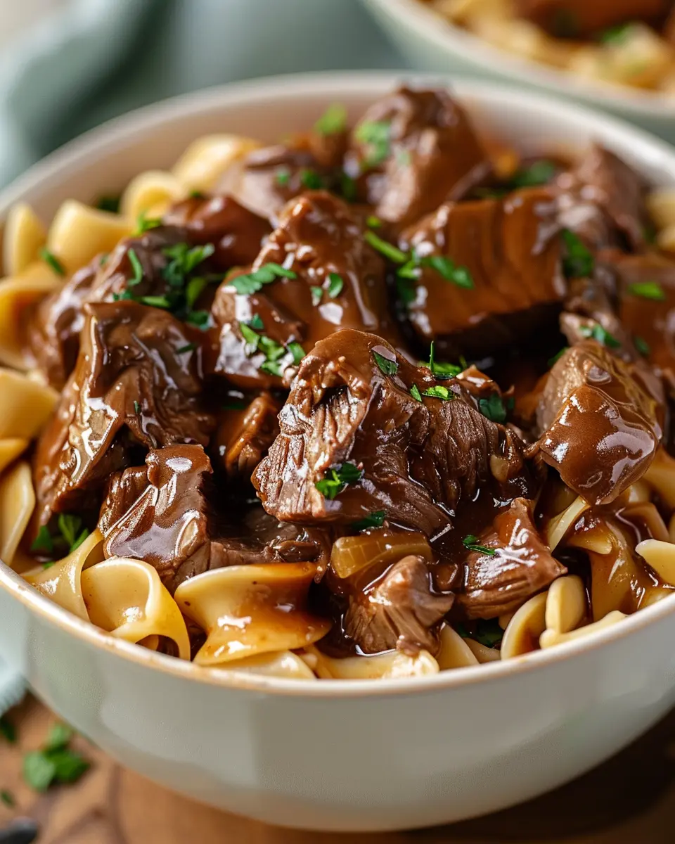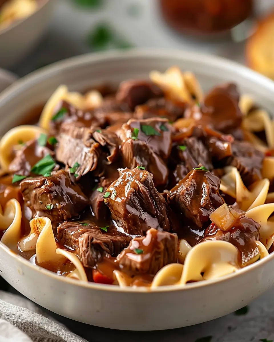 Enjoy a comforting bowl of homemade stovetop beef and noodles, perfect for any day of the week.