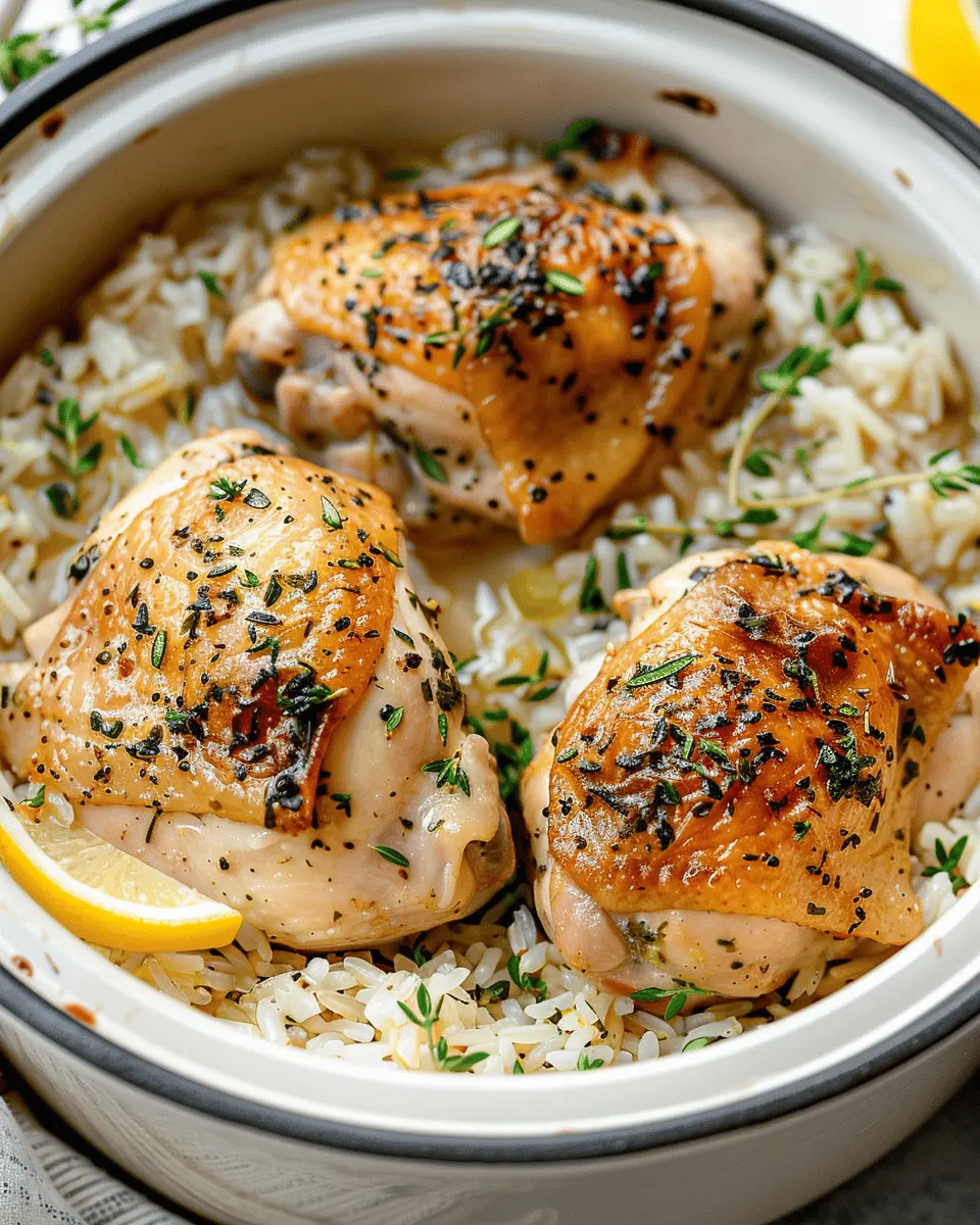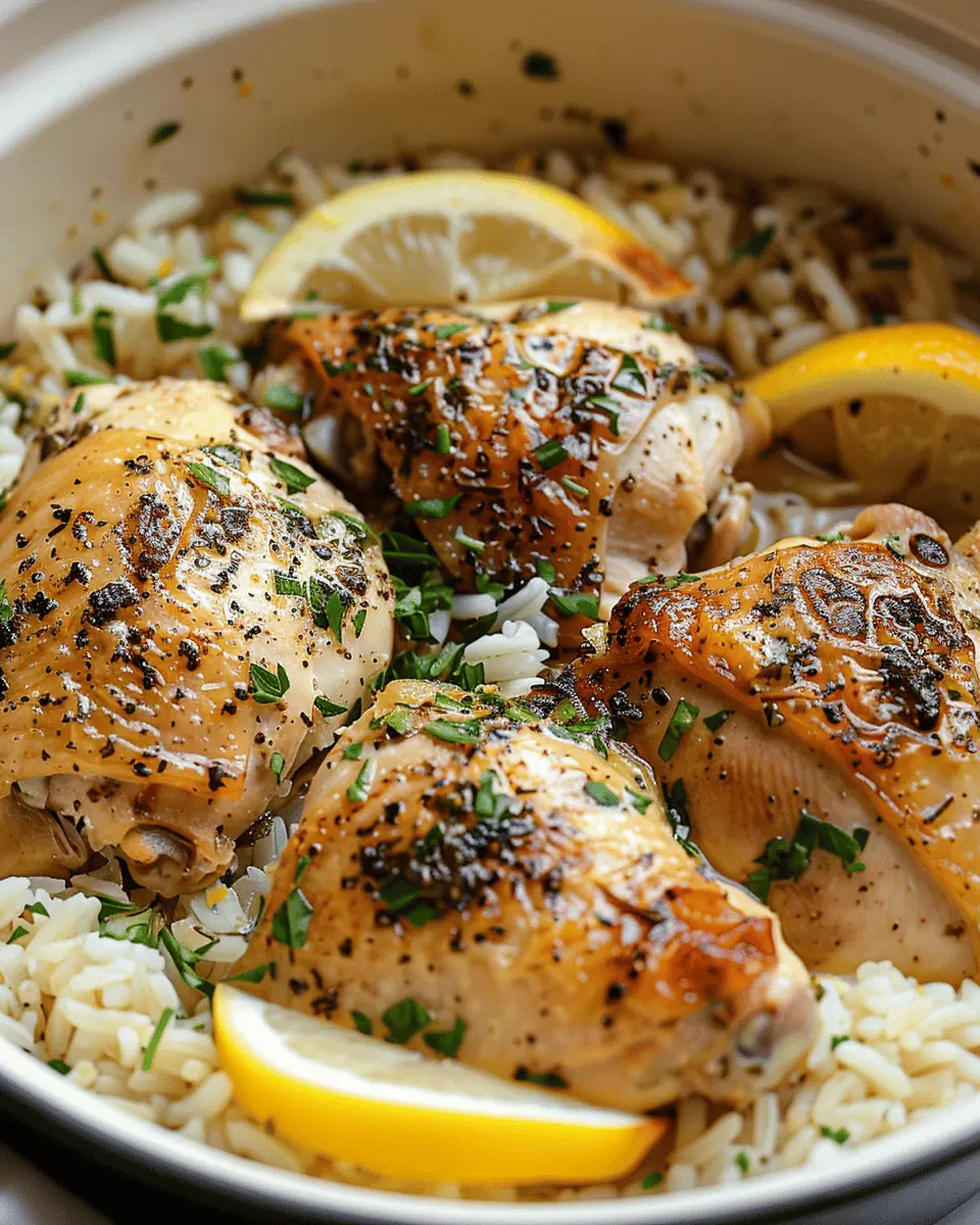 A delicious and easy slow cooker recipe featuring chicken, rice, and vibrant lemon and herb flavors, perfect for family meals.