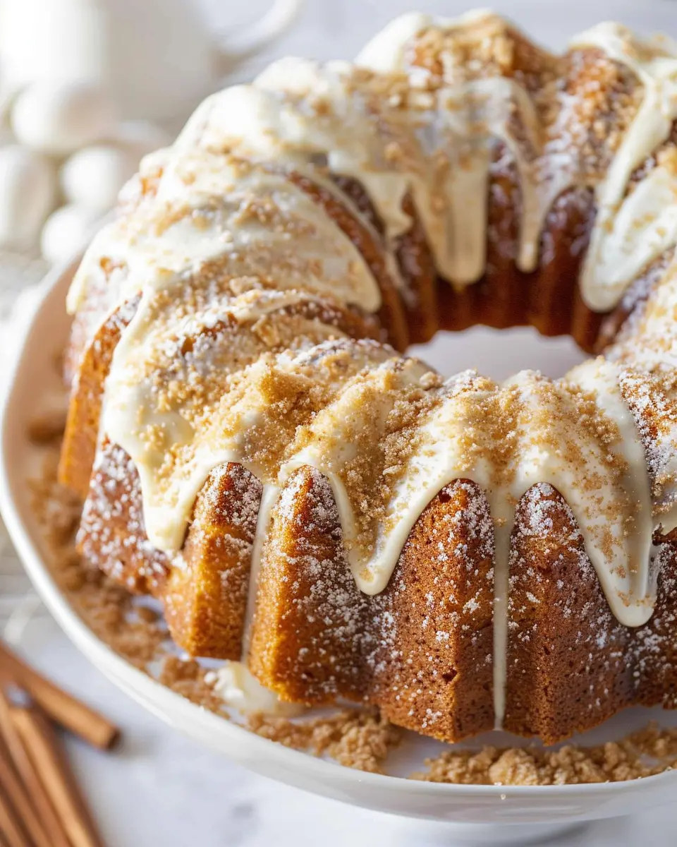 Once your cake has cooled for about 10-15 minutes in the pan, carefully invert it onto a cooling rack. Drizzle the cream cheese glaze over the top and let it drip down the sides. If you like, sprinkle a touch more cinnamon-sugar on top for that extra flair.
