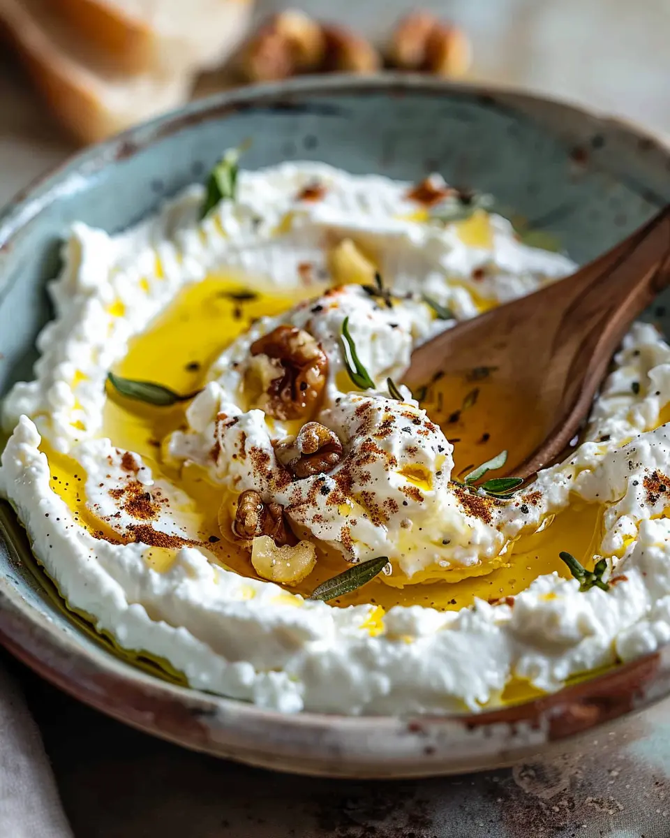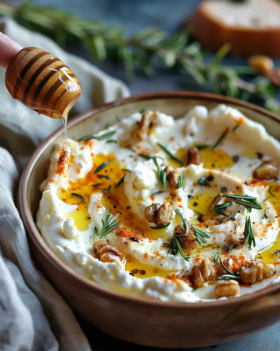 Now that your dip and drizzle are ready, it’s time to assemble everything beautifully. Take your blended ricotta mixture and transfer it into a serving bowl. Use the back of a spoon to create a slight well in the center and drizzle your hot honey generously over the top. Sprinkle some chopped parsley for a touch of color; this makes the dish look even more appetizing!