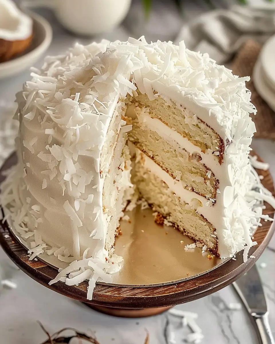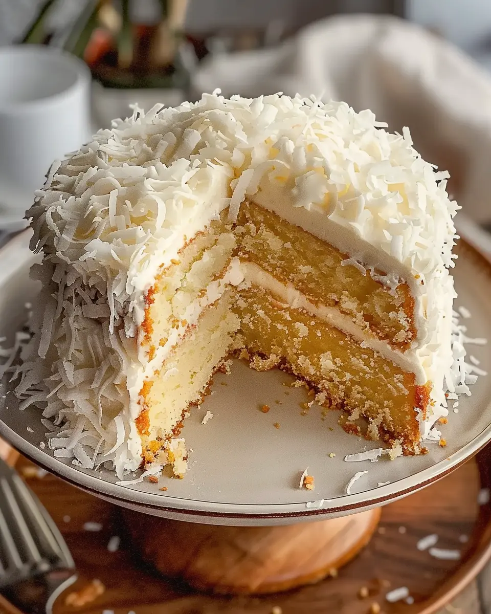 - For decoration, sprinkle additional shredded coconut on top and around the sides for that authentic coconut look!
